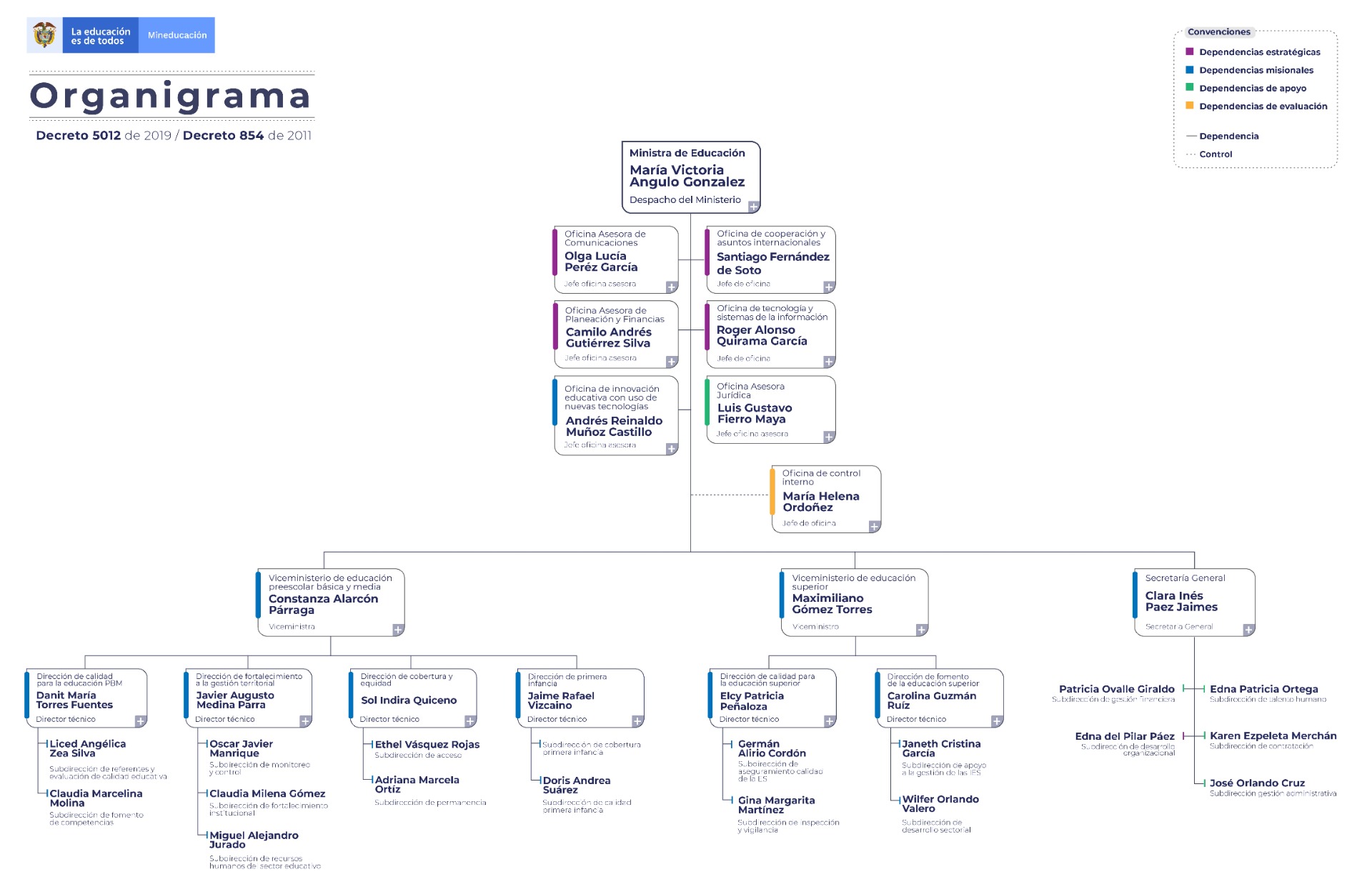 Con la expedición del decreto 5012 de 28 de diciembre de 2009y el decreto 854 de marzo 23 de 2011, fueron aprobados los cambios en la planta de personal del Ministerio de Educación. Ver nuevo organigrama.